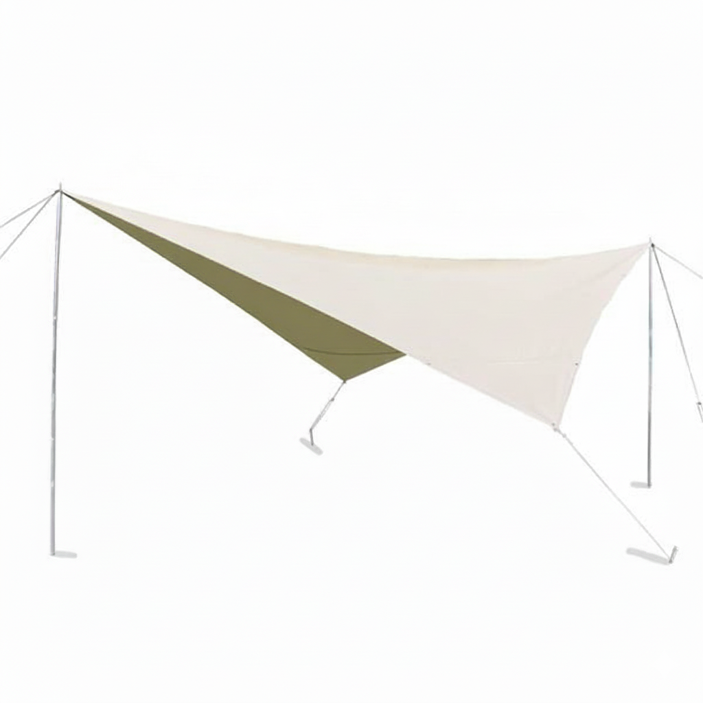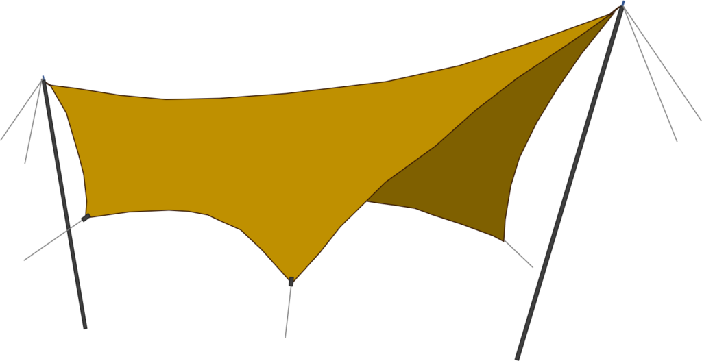 五角形で小型の布を2本のポールとロープで張る、非自立式タープです。